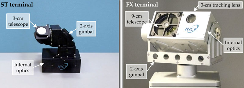 Терминалы NICT используют как выполненные по специальному заказу компоненты (например, телескоп диаметром 9 см), так и модифицированные коммерческие элементы, а также серийные широкодоступные детали. Именно эти три подхода обеспечили разработку и создание наиболее компактных и скоростных на сегодня оптических беспроводных терминалов связи.