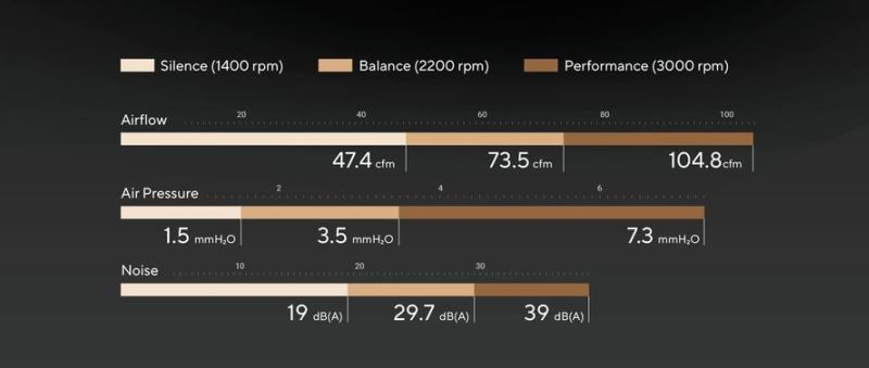 В конструкции ProArt PF120 используется трехфазный шестиполюсный мотор, обеспечивающий плавную, но мощную работу за счёт способности функционировать на более низкой частоте. Корпус подшипника выполнен из латуни, а сам подшипник гидродинамический. Всё это минимизирует шум и вибрацию, повышая эффективность охлаждения и снижая уровень шума. На пиковых оборотах воздушный поток достигает 104,8 CFM при уровне шума 39 дБ.
