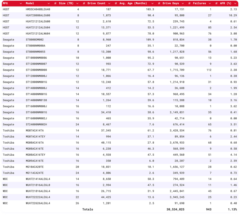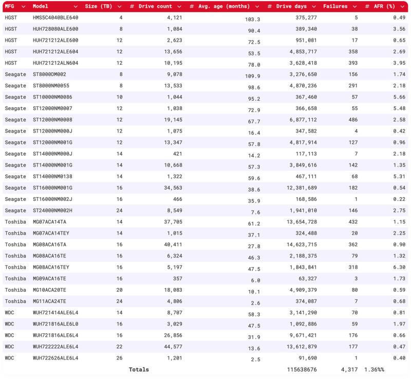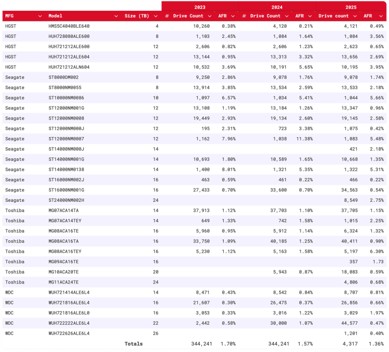В годовой отчёт Backblaze включила 344 196 экземпляров жёстких дисков — всего 30 моделей. Общегодовой показатель AFR по всему парку в 2025 году составил 1,36 % по сравнению с 1,55 %, которые были в 2024 году. Квартальные результаты за последние 12 месяце колебались, но результат за весь год отражает ощутимое улучшение. Ни одна модель не показала нулевого числа отказов за год, но у некоторых моделей наблюдалось очень низкое их число, в среднем менее двух отказов за квартал. Это, в частности, HGST HMS5C4040BLE640 (4 Тбайт, 5 отказов), Seagate ST12000NM000J (12 Тбайт, 4), Seagate ST14000NM000J (14 Тбайт, 7), Seagate ST16000NM002J (16 Тбайт, 1), Toshiba MG09ACA16TE (16 Тбайт, 3), WDC WUH722626ALE6L4 (26 Тбайт, 1).