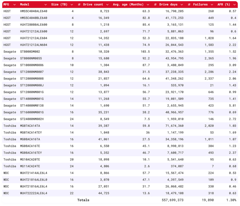 В течение квартала модели HGST HMS5C4040BLE640 (4 Тбайт), Seagate ST12000NM000J (12 Тбайт) и Seagate ST16000NM000J (16 Тбайт) продемонстрировали всего по одному отказу; вышел также из строя один вышеупомянутый WDC на 26 Тбайт — в первый же квартал эксплуатации. Модели Seagate ST8000NM000A (8 Тбайт) и Seagate ST16000NM002J (16 Тбайт) не вышли из строя ни разу. Наименее надёжными оказались HGST HUH728080ALE600 (8 Тбайт) со среднегодовым уровнем отказов (AFR) 10,29 %, Seagate ST10000NM0086 (10 Тбайт) с 5,23 % и Toshiba MG08ACA16TEY (16 Тбайт) с 4,14 %.