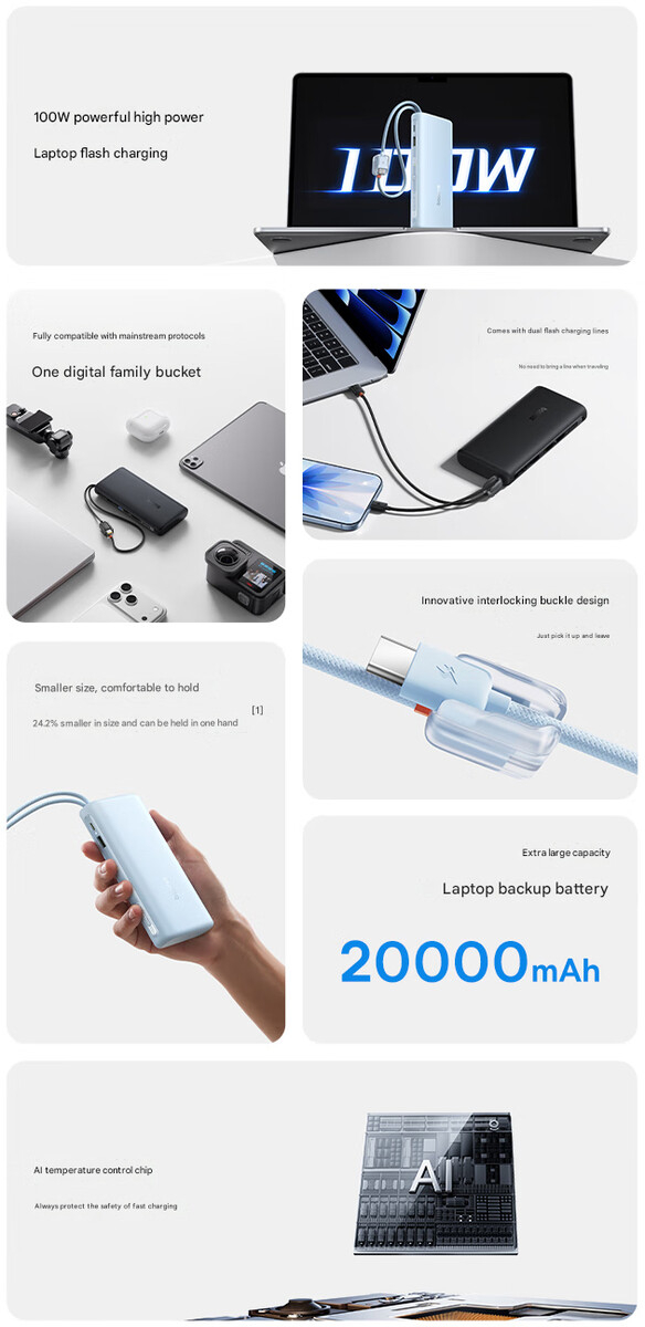 Baseus отмечает, что пауэрбанк совместим со стандартами SCP, AFC, FCP, QC, PD, UFCS и PPS. Благодаря такой широкой совместимости он работает практически с любыми устройствами, включая маломощные аксессуары, такие как наушники. Он также поддерживает быструю зарядку мощностью 100 Вт. По словам Baseus, это позволяет зарядить батарею 13-дюймового MacBook Air до 36 % всего за 30 минут.