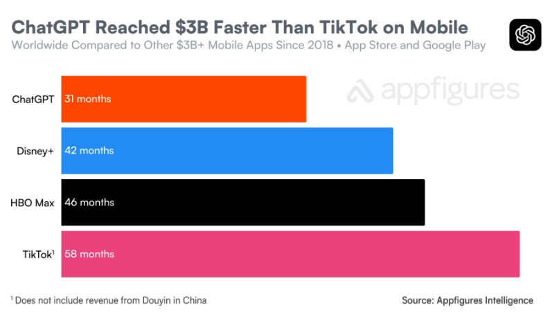 ChatGPT потребовался 31 месяц, чтобы достичь объёма потребительских расходов в $3 млрд, в то время как лидеру рынка TikTok на достижение аналогичной выручки потребовались 58 месяцев. Приложение ChatGPT также достигло этого рубежа быстрее, чем ведущие стриминговые сервисы, такие как Disney+ и HBO Max, которым понадобились 42 и 46 месяцев соответственно.