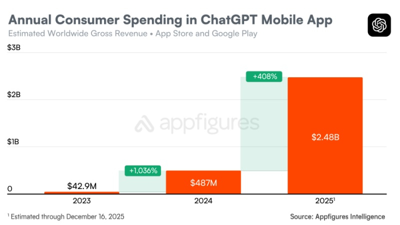 По оценкам аналитической компании Appfigures, на этой неделе мобильное приложение ChatGPT достигло нового рубежа в $3 млрд потребительских затрат в мировых масштабах. Этот показатель представляет собой общие расходы пользователей на устройствах iOS и Android с момента запуска приложения в мае 2023 года. В 2025 году потребители потратили в мобильном приложении ChatGPT $2,48 млрд, что на 408 % больше $487 млн в 2024 году и на 5780 % больше $42,5 млн в 2023 году.