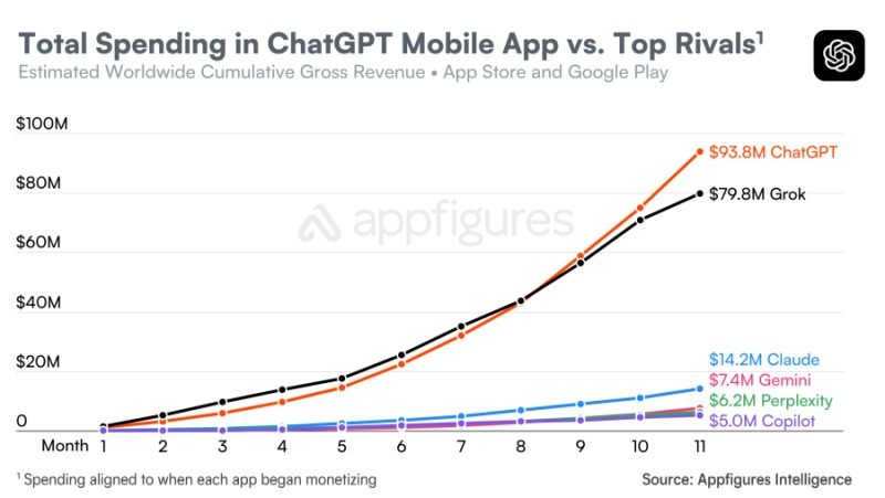 Среди конкурирующих приложений похожую динамику демонстрирует Grok от xAI. Чат-бот Grok появился в конце 2023 года у подписчиков X Premium Plus, а в прошлом году стал широко доступен для всех пользователей. Если сравнивать темпы роста потребительских расходов в различных приложениях на основе ИИ, Grok наиболее приблизился к совокупному доходу ChatGPT на том же этапе после начала монетизации.