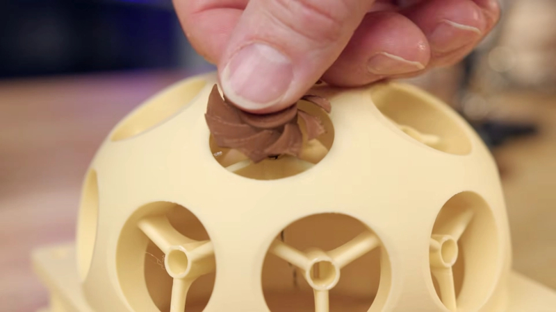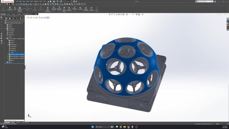 Для размещения всех вентиляторов внутри одной рамки использована трёхмерная модель, разработанная в приложении SolidWorks. Конструкция выполнена в виде куполообразного корпуса с равномерным распределением элементов по поверхности. Такое расположение обеспечивает размещение пятнадцати вентиляторов внутри ограниченного пространства диаметром 120 мм. Геометрия корпуса позволяет интегрировать все компоненты в единую структуру.