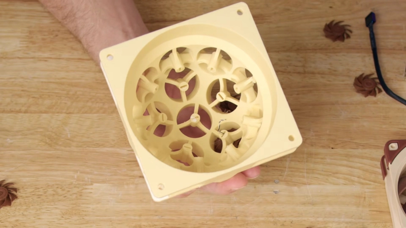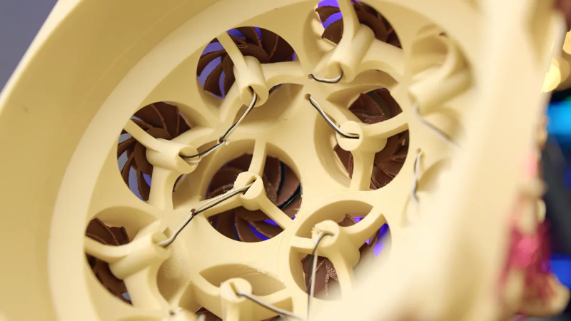 Каждый двигатель приводит в движение вентилятор диаметром 30 мм, изготовленный методом 3D-печати. Геометрия вентиляторов повторяет дизайн Noctua NF-A12x25 с уменьшением масштаба до соответствующего размера. Суммарная площадь всех модулей соответствует площади одного вентилятора диаметром 120 мм.