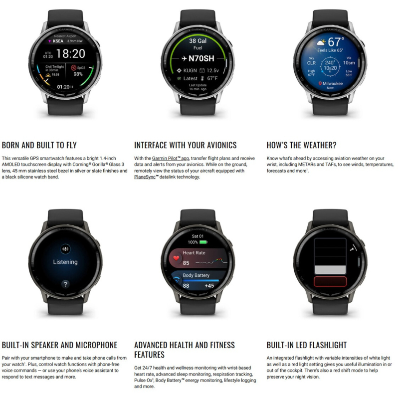 Новинка также предлагает встроенный светодиодный фонарик. В составе программного обеспечения заявлено приложение Garmin Pilot, которое предоставляет данные о полёте, навигационную информацию, утренний отчёт о состоянии лётной обстановки и другую полезную информацию для пилотов.