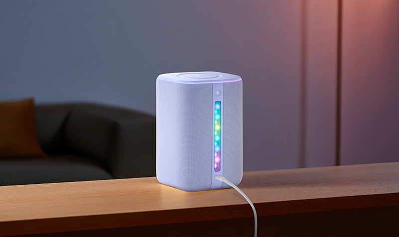 Светодиоды на задней стороне корпуса мягко подсвечивает стену, создавая атмосферный фон. Такое эмбиент-освещение можно использовать в роли ночника с имитацией пламени свечи, декоративной лавовой лампы, цветомузыки или просто для спокойной подсветки помещения вечером. Оттенки можно детально настраивать — устройство отображает до 16 млн цветов. Дополняет визуальный образ и фирменная круговая светодиодная полоса в верхней части корпуса, которая отображает статусы «Алисы» и другие системные сигналы.