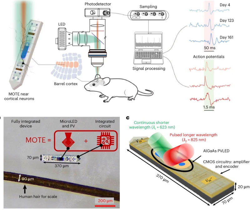 Учёные Корнеллского университета (Cornell) создали один из самых маленьких в истории нейронный имплантат под названием microscale optoelectronic tetherless electrode (MOTE), который меньше крупинки соли — его размеры составляют 370 × 70 мкм. Это устройство способно длительно и без проводов передавать данные об активности мозга в живом организме. Это крайне важно для изучения нейронной активности мозга, в области чего вопросов больше, чем ответов.
