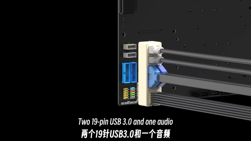 Разъёмы ввода-вывода на передней панели, такие как USB-C, USB 3.0, аудиоразъёмы и т.д., объединены в один блок, который тоже располагается на обратной стороне платы и подключается к корпусу одним жгутом проводов. Дополнительные 4-контактные разъёмы на задней панели платы обеспечивают питание до четырёх накопителей SATA, заменяя отдельные кабели питания SATA.
