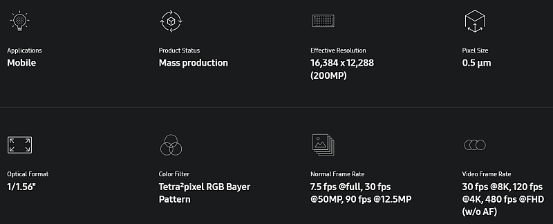 Samsung заявила, что обработка фотографий с разрешением 200 Мп займёт всего две секунды, а технологии ступенчатого HDR и Smart-ISO Pro улучшают качество HDR-снимков. Сенсор обеспечивает сохранение изображений в RAW-формате с 14-битным цветом, запись 8K видео со скоростью 30 кадров/с, 4K видео — со скоростью 120 кадров/с, а также максимальную скорость в 480 кадров/с при разрешении 1080p (без автофокуса).