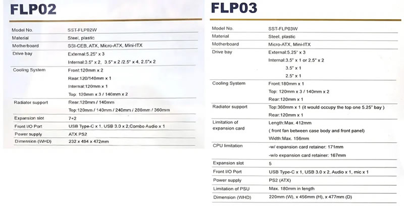 В то же время уменьшенные размеры FLP03 повлекли за собой ограничения в совместимости: корпус не поддерживает материнские платы форматов SSI-CEB и ATX, которые допускались в FLP02. Кроме того, новинка получила меньшее количество отсеков для накопителей и слотов расширения, а также переработанную систему охлаждения и поддержки радиаторов. Тем не менее, FLP03 сохраняет высокий уровень совместимости с современными компонентами. В него можно установить видеокарты длиной до 412 мм, процессорные кулеры высотой до 171 мм, а также блоки питания стандартного формата ATX.