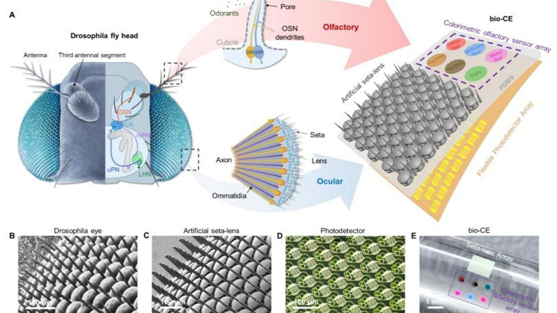 Обонятельная компонента реализована методом струйной печати на той же платформе: массив колориметрических сенсоров меняет цвет при контакте с опасными газами и химикатами, имитируя «нюх» насекомого. Дополнительно между линзами добавлены щетинки, как у настоящих насекомых, что необходимо для защиты от запотевания во влажной среде. Щетинки удержат капельки влаги на себе и не дадут им затянуть линзы.